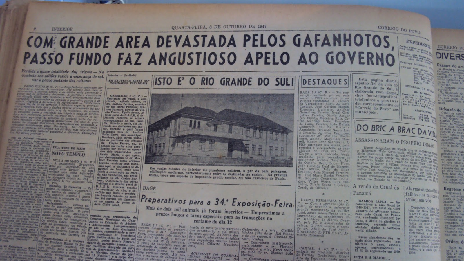 Uma das chamadas pragas descritas na Bíblia e que desde sempre assolaram a humanidade, devastando regiões agrícolas inteiras e trazendo fome e desespero, as nuvens de gafanhotos parecem, hoje, algo lendário e quase inverossímel para estes tempos tecnológicos, com as mais diferentes e poderosas formas químicas de combatê-los. Mas, há 70 anos - mais precisamente em setembro e outubro daquele ano - o Rio Grande do Sul experimentou os efeitos de tais insetos devoradores e que destruíram lavouras em cerca de 50 municípios, chegando até mesmo à Capital. A própria Brigada Militar foi mobilizada para combatê-los, como se vê nestas reproduções do Correio do Povo. Os gafanhotos encontravam então um mundo desaparelhado para enfrentá-los, já que não havia DDT ou outros agrotóxicos - agrotóxicos estes que, embora benéficos em tantos pontos, são por si mesmo outros venenos a atentar contra a natureza e as vidas humanas. A despeito do nosso espanto, tais fenômenos não são incomuns e aconteceram nos últimos anos no mundo como um todo, incluindo o Brasil.